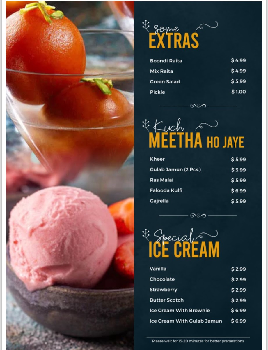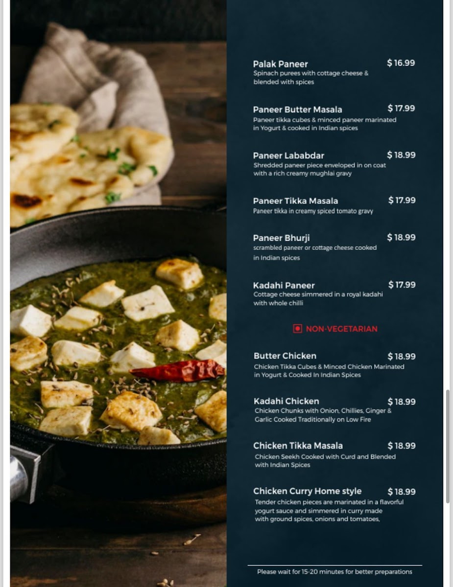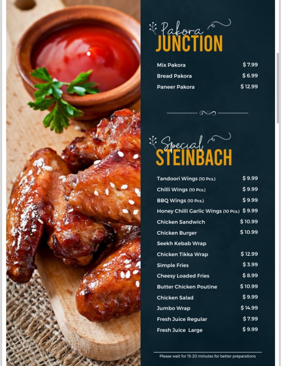 As a reviewer, I found the menu at The Indian Spice Club to be a well-rounded celebration of Indian flavors, thoughtfully curated to suit a wide range of tastes at its Steinbach location. The beverage selection sets the tone with classic spirits like Dewar's White Label, JW Red, JW Black, Chivas Regal, and Glenfiddich 12 Yr, alongside popular beers such as Molson Canadian, Kokanee, Coors Light, Budweiser, and Heineken, complemented by whiskies like Gibsons Rare and Crown Royal, and rums including Havana Club and Captain Morgan. On the food side, the non-vegetarian offerings-Butter Chicken, Kadahi Chicken, Chicken Tikka Masala, and Chicken Curry Home Style-deliver the comforting, rich gravies Indian cuisine is known for. Lighter sips like Mojito, Green Apple, Lemonade, Orange Juice, and Apple Juice refresh the palate, while snacks from Mix Pakora, Bread Pakora, and Paneer Pakora add crispy indulgence. The “Special Steinbach” section stands out with crowd-pleasers such as Tandoori Wings, Chilli Wings, BBQ Wings, Honey Chilli Garlic Wings, and a hearty Chicken Sandwich. Indian street food lovers will appreciate Vada Pav, Baand Cholle, Noodle Burger, Tandoori Soya Chaap, and Soya Malai Chaap, while chaat favorites like Veg. Samosa, Channa Samosa, Aloo Tikki, Dahi Bhalla, and Chat Papri bring tangy, layered flavors. Extras such as Boondi Raita, Mix Raita, Green Salad, and Pickle round out the meal, leading seamlessly into desserts like Kheer, Gulab Jamun, Ras Malai, Falooda Kulfi, and Gajrella, plus Vanilla, Chocolate, Strawberry, Butter Scotch, and Ice Cream With Brownie. From Amritsari Kulcha and Poori Channa at breakfast to mains like Dal Maha Makhani, Dal Tadka, Mix Veg, Chana Masala, and Aloo Gobi, finished with breads such as Tawa Roti, Tandoori Roti, Lachha Prantha, Plain Naan, and Butter Naan, the menu feels complete, authentic, and satisfying-an inviting conclusion to a diverse Indian dining experience.