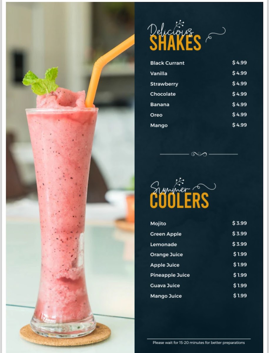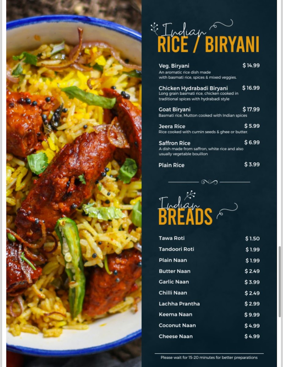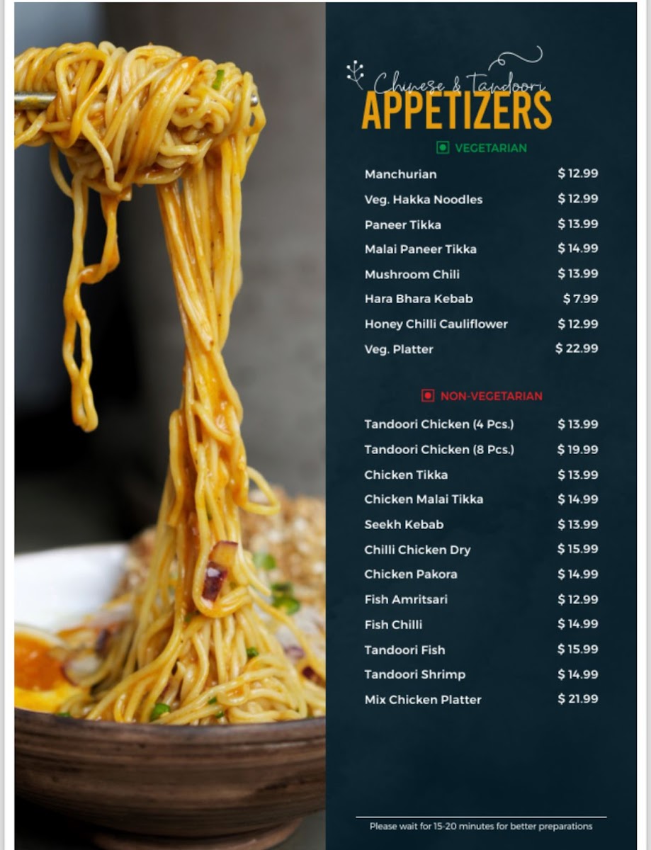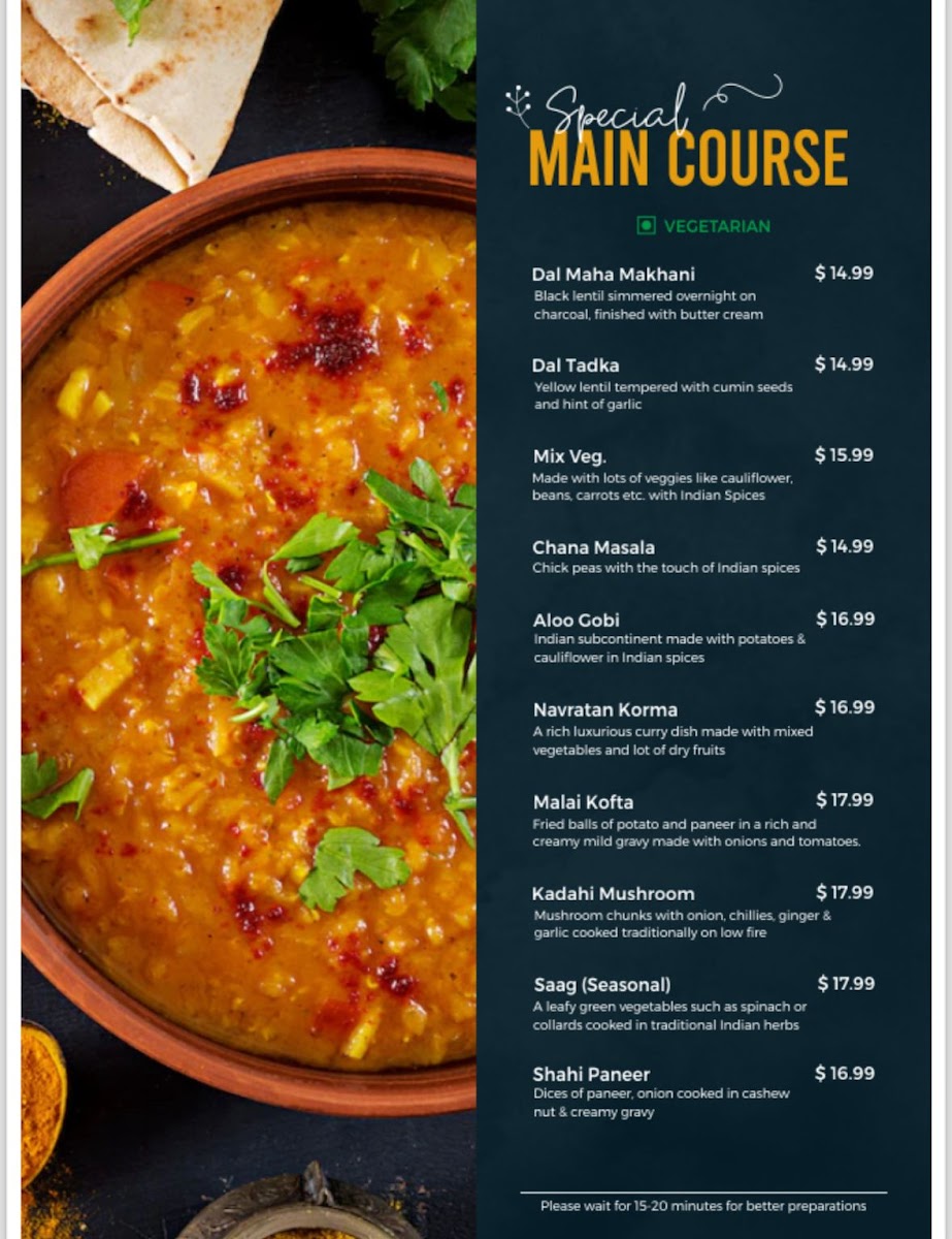 As a reviewer, I found the menu at The Indian Spice Club to be a well-rounded celebration of Indian flavors, thoughtfully curated to suit a wide range of tastes at its Steinbach location. The beverage selection sets the tone with classic spirits like Dewar's White Label, JW Red, JW Black, Chivas Regal, and Glenfiddich 12 Yr, alongside popular beers such as Molson Canadian, Kokanee, Coors Light, Budweiser, and Heineken, complemented by whiskies like Gibsons Rare and Crown Royal, and rums including Havana Club and Captain Morgan. On the food side, the non-vegetarian offerings-Butter Chicken, Kadahi Chicken, Chicken Tikka Masala, and Chicken Curry Home Style-deliver the comforting, rich gravies Indian cuisine is known for. Lighter sips like Mojito, Green Apple, Lemonade, Orange Juice, and Apple Juice refresh the palate, while snacks from Mix Pakora, Bread Pakora, and Paneer Pakora add crispy indulgence. The “Special Steinbach” section stands out with crowd-pleasers such as Tandoori Wings, Chilli Wings, BBQ Wings, Honey Chilli Garlic Wings, and a hearty Chicken Sandwich. Indian street food lovers will appreciate Vada Pav, Baand Cholle, Noodle Burger, Tandoori Soya Chaap, and Soya Malai Chaap, while chaat favorites like Veg. Samosa, Channa Samosa, Aloo Tikki, Dahi Bhalla, and Chat Papri bring tangy, layered flavors. Extras such as Boondi Raita, Mix Raita, Green Salad, and Pickle round out the meal, leading seamlessly into desserts like Kheer, Gulab Jamun, Ras Malai, Falooda Kulfi, and Gajrella, plus Vanilla, Chocolate, Strawberry, Butter Scotch, and Ice Cream With Brownie. From Amritsari Kulcha and Poori Channa at breakfast to mains like Dal Maha Makhani, Dal Tadka, Mix Veg, Chana Masala, and Aloo Gobi, finished with breads such as Tawa Roti, Tandoori Roti, Lachha Prantha, Plain Naan, and Butter Naan, the menu feels complete, authentic, and satisfying-an inviting conclusion to a diverse Indian dining experience.